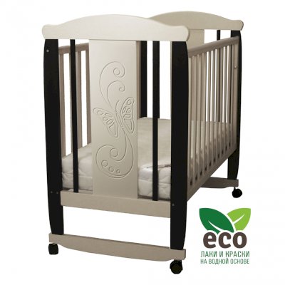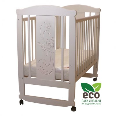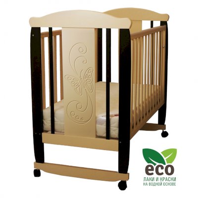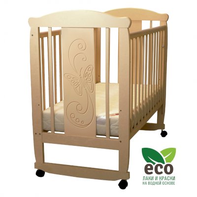 Кроватка декорирована фрезерным рисунком "Бабочка". Уникальные фрезерные рисунки размером от 50 см на обеих спинках.