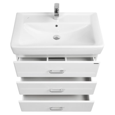 Современная лаконичная модель тумбы AQUATON Америна 70 М с тремя ящиками имеет ширину 70 см и выполнена в белоснежном глянцевом цвете.