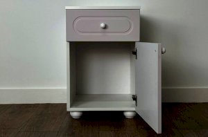 Модель оснащена выкатным ящиком на шариковых направляющих, обеспечивающих плавный и надёжный ход. В нижней части расположено отделение с распашной дверцей, которое подойдёт для хранения книг, игрушек, аксессуаров или текстиля.