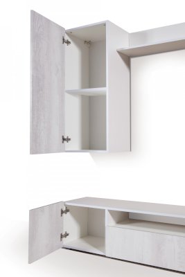 Шкаф «Прага-3» подойдет как для небольшой по габаритам гостиной, так и для просторной. Вместительная тумба под ТВ оснащена двумя открытыми нишами, закрытыми секциями с распашными дверьми по бокам и закрытой секцией с откидной дверью посередине. Навесной шкаф оборудован полкой из ЛДСП, выдерживающей вес до 5 кг. Открытая полка вместительна и устойчива, она придаёт законченный вид композиции в целом.