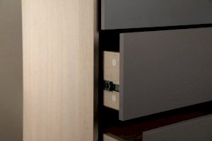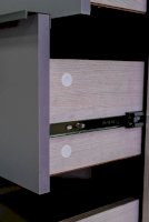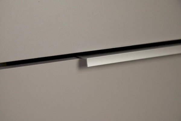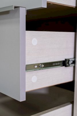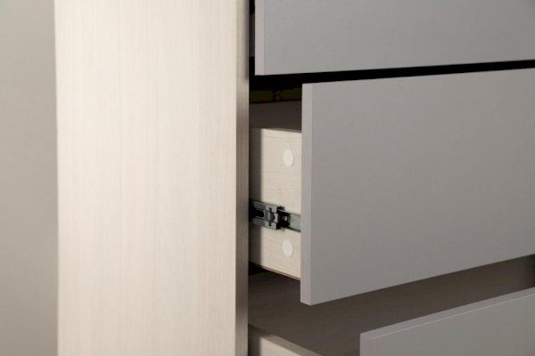 Оригинальность модели придают ручки необычного вида. Пластиковая ручка-скоба расположена на фасаде ящика ассиметрично и выполнена в пластике серебристого цвета, который поддерживает серый цвет фасадов ящиков.